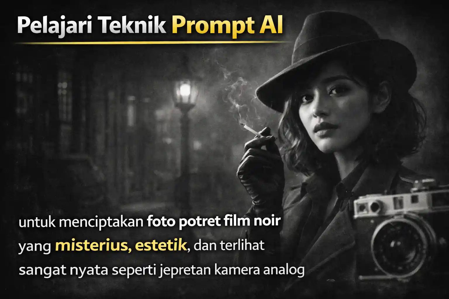 Pelajari teknik prompt AI untuk menciptakan foto potret film noir yang misterius, estetik, dan terlihat sangat nyata seperti jepretan kamera analog.
